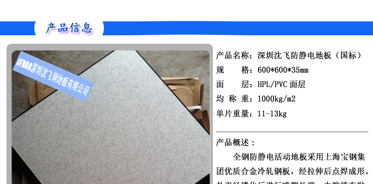 全鋼防靜電地板 【規(guī)格型號】 600×600×35mm 【產(chǎn)品概述】 全鋼防靜電活動地板采用上海寶鋼集團(tuán)優(yōu)質(zhì)合金冷軋鋼板,經(jīng)拉伸后點焊成形。外表經(jīng)磷...