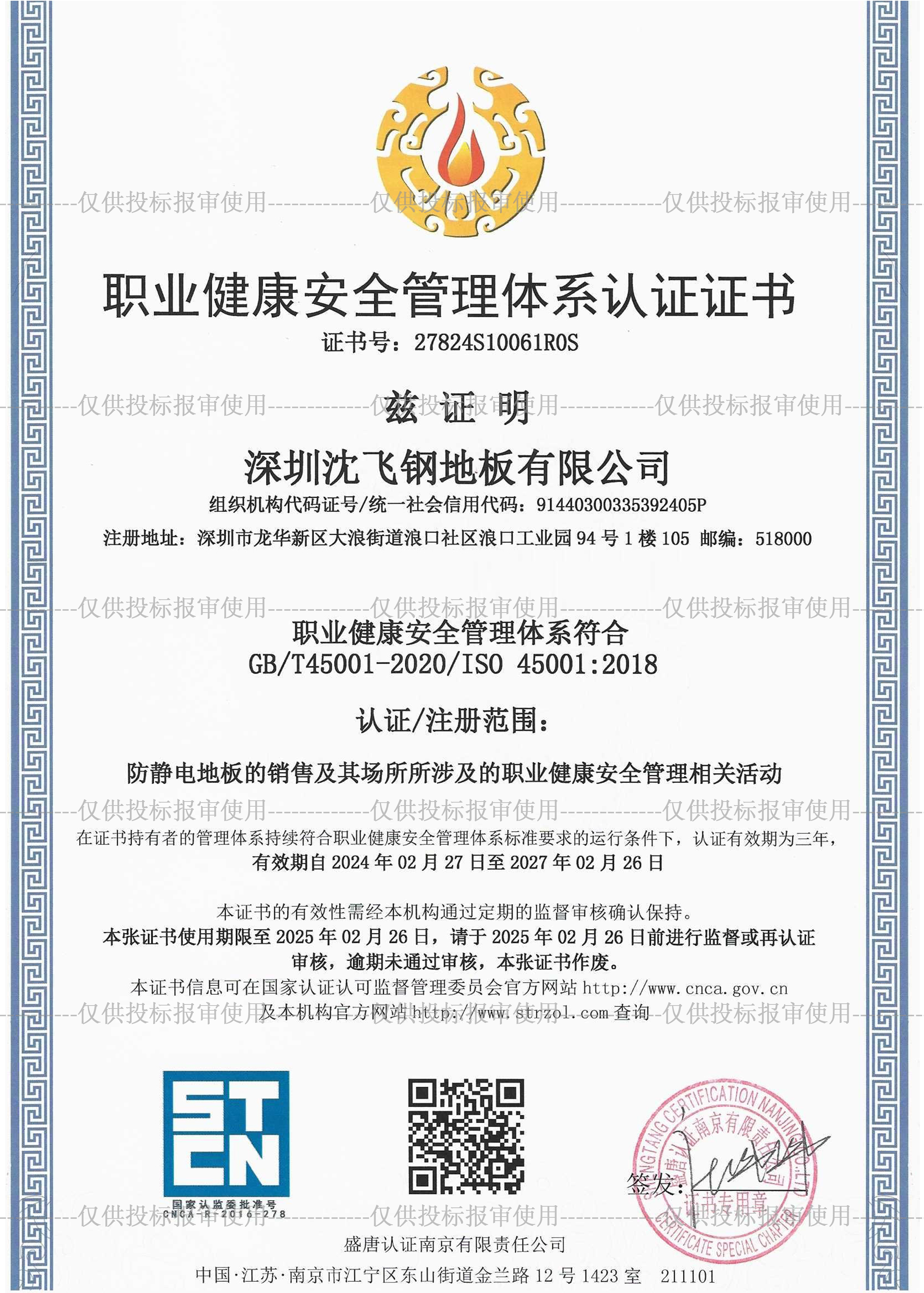 注:以上證書為深圳沈飛鋼地板有限公司所有,未經允許不能復制修改作為其它使用,造成企業損失本公司有權追究相關法律責任