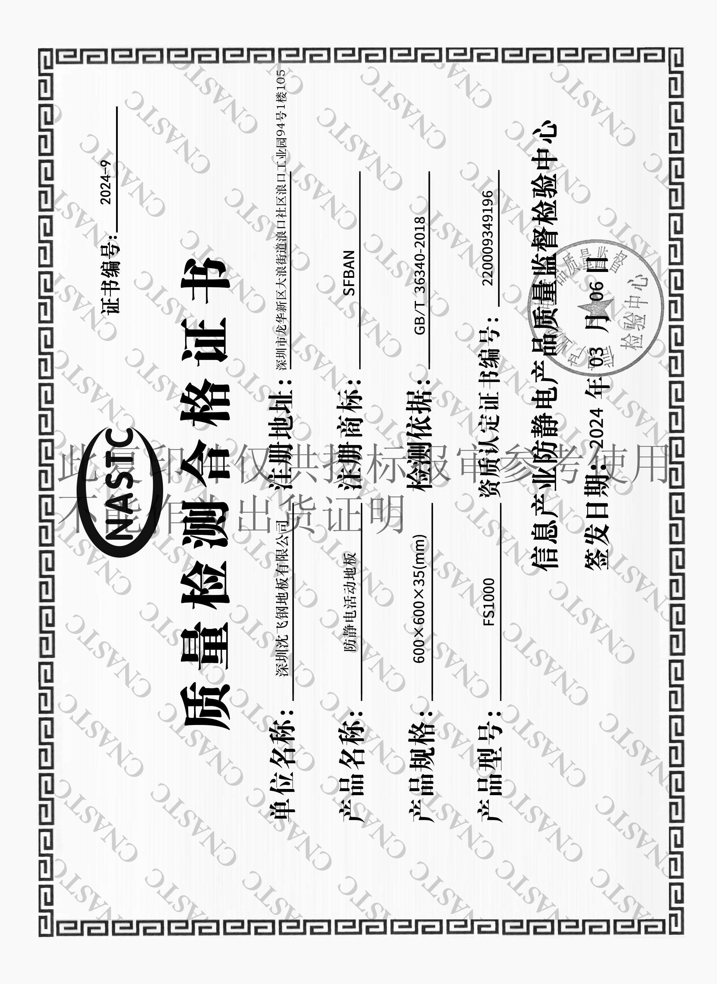 本公司防靜電地板產品通過GB/T 36340-2018標準,經檢測機構“信息產業防靜電產品質量監督檢驗中心”檢驗通過符合國家有關標準及要求。